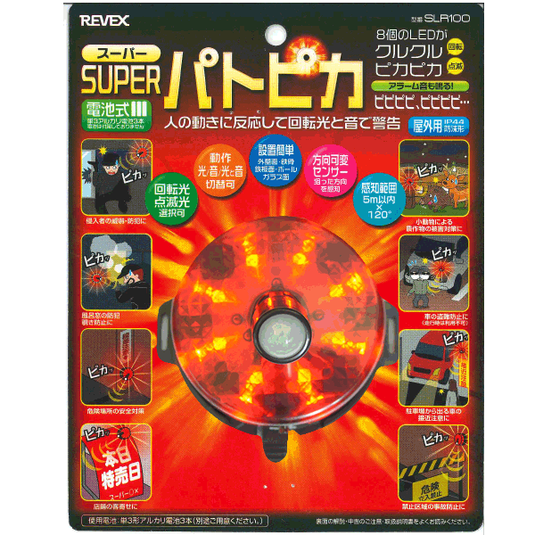 | 電池寿命 | 1日10回(15秒間/1回)動作時、光と音では約6ヶ月、光だけでは約1年間。電池寿命は動作回数により変動します |